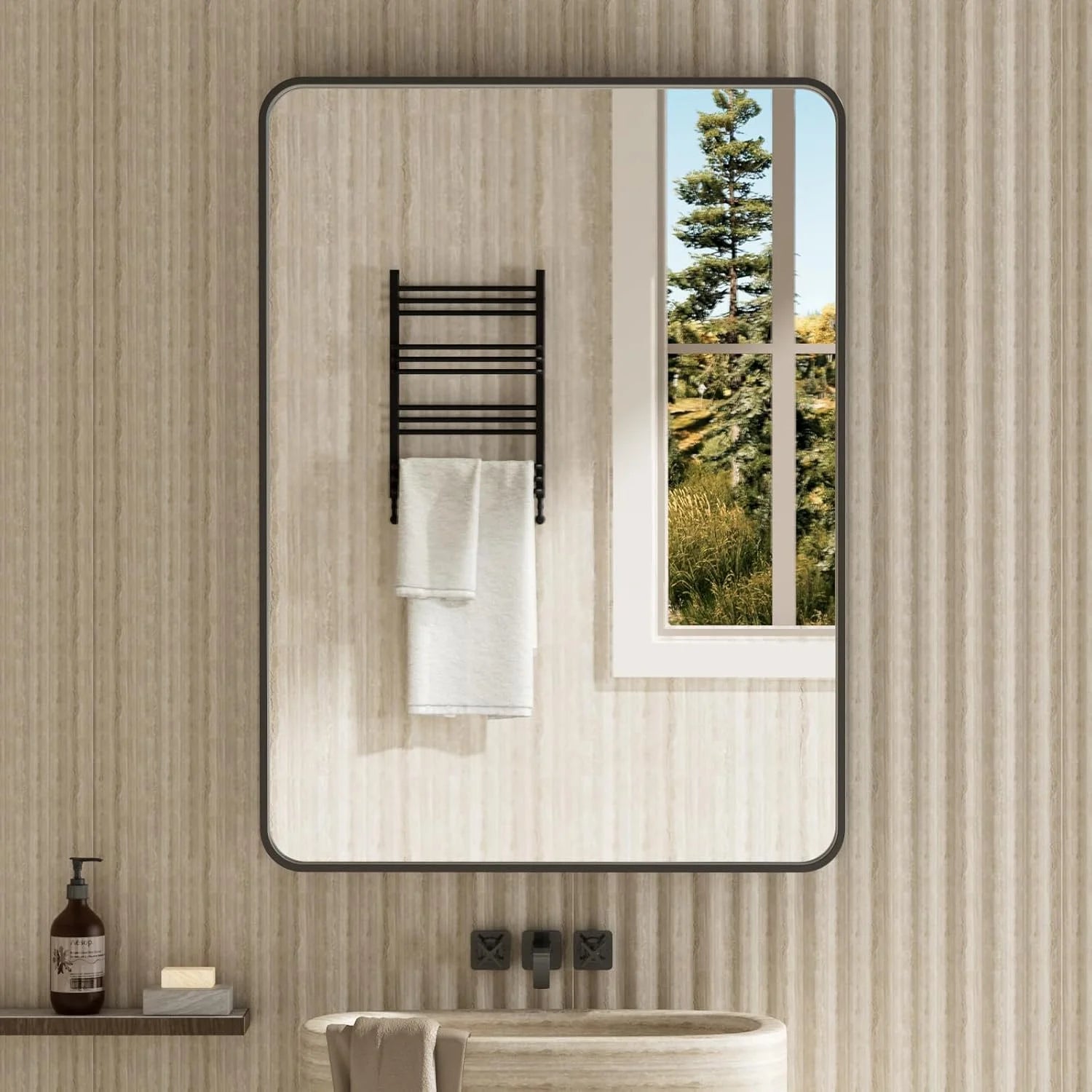 【Durable Silver Metal Framed Mirror】: Black bathroom vanity mirror is made of premium brushed alumium alloy frame, which is anti-rust and non-deformed. Practical rectangle rounded corner mirror with simple classic clean line features the modern and industry style;